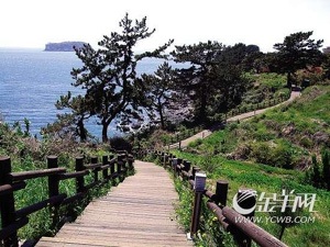 很多人走线路8,为的就是看济州这座火山岛的火山痕迹。走到近一半的时候,柱状节理带就出现了。这种地质是熔岩被推向大海而形成的,形态各有千秋。大大小小的四方或六角形石柱大多近30米高,“挤”在一起像用梳子梳过一样。节理带最美的一段路上还种上了争奇斗艳的紫芒,有5公里长,十分养眼。