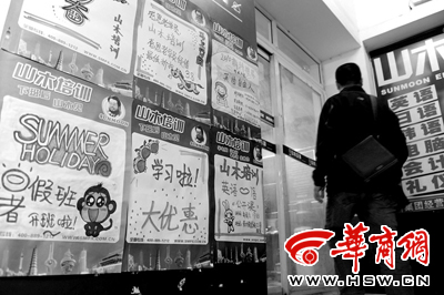 前日下午,记者在西安山木培训总部看到,这里到处都悬挂着印有山木头像的宣传单,甚至在女厕所门上也不例外。