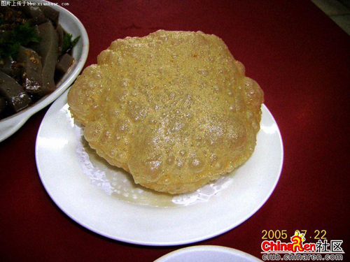 泡泡油糕色泽乳白,表皮蓬松,犹如轻纱织就,蝉翼作成,可谓巧夺天工。它之所以受到人们的青睐主要是因为它的制作方法有着独到之处。平时人们吃的油条油饼蓬松发虚主要是因为钒碱和面粉的配比恰当,放入热油中所产生的二氧化碳气体膨胀所致。而泡泡油糕既不放钒也不施碱,只是利用大油和水烫面,同样蓬松涨发。它要求糕饼师一定要具有高超的技术和丰富的经验,大油、水、面的比例一定要恰倒好处,对油温的要求也很严格,当油糕投入到一定 温度的油锅内,内部水蒸气大量形成,气体急剧上升的同时,蛋白质性变而展开,淀粉膨胀焦化,气泡逐渐形成,并在高温环境中固定下来,要求出锅的油糕不落架(不蔫不瘪)。 |