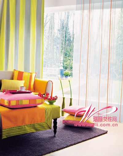 色块组合形成条纹沙发上的多彩条纹图案,是用粉红、新绿、粉蓝、深蓝等不同颜色的布料组拼设计形成的,虽然沙发的款式看着古老,但亮丽的彩色条纹却让它变得很年轻。沙发 特瑞菲克