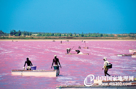 然而在沙丘的另一边,却是一个截然不同的世界:一个粉红色的椭圆形湖泊宁静地安卧在金色的沙漠之中,与碧蓝色的大西洋近在咫尺。皮肤黝黑的男人赤膊驾着小舟在粉红色的湖水中打捞作业,身着艳丽衣裙的女人在岸上成片的白色盐丘边忙碌,空中隐隐约约飘荡着节奏舒缓的民歌旋律,到处是一片宁静恬然。