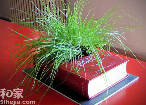 这样的花器自己在家也能DIY一个。选用比较厚的精装书籍,在中间挖上一个洞,购买不到专业的隔离涂料也没有关系,那就选择造型方正的普通盆栽放在里面即可。其实它就像是一个花盆的外部伪装
