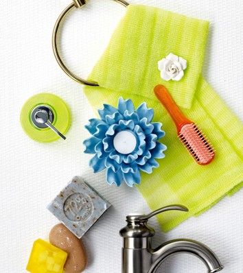选择饱和度相对较高的明艳撞色作为浴室搭配的方法,色彩斑斓的自然色则为首选。除毛巾环与水龙头,大多数配饰以天然材质为主,更好地凸显撞色带来的视觉效果。金色的毛巾环搭配草绿色毛巾,相同颜色的洗手液瓶与之相互呼应,天蓝色烛台与白色的花朵香熏相互映衬,整体氛围轻快活泼。手工皂虽为暗色系,但颜色和纹理的变化增加了不少趣味性。