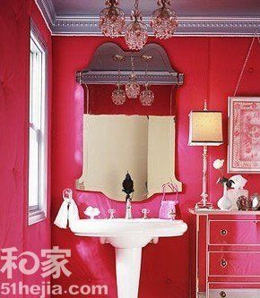 玫红色的卫浴间非常迷人,是许多女性的最爱。全身镜面的浴室柜等大量的镜面运用,增加了空间的视觉面积和通透感。卫浴间里的洁具线条大都柔美,搭配上复古的水晶吊灯彰显出生活的品味。