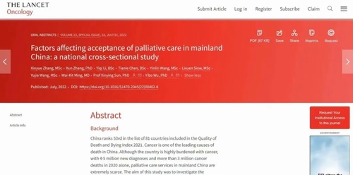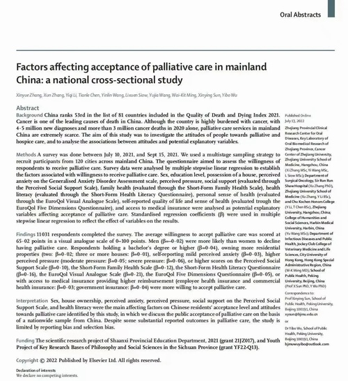 论文摘要发表于国际著名学术期刊《Lancet Oncology》(JCR Q1;IF=54.433)。本研究聚焦于人们对安宁疗护和临终关怀的接受程度,并分析其与潜在解释变量之间的关系。